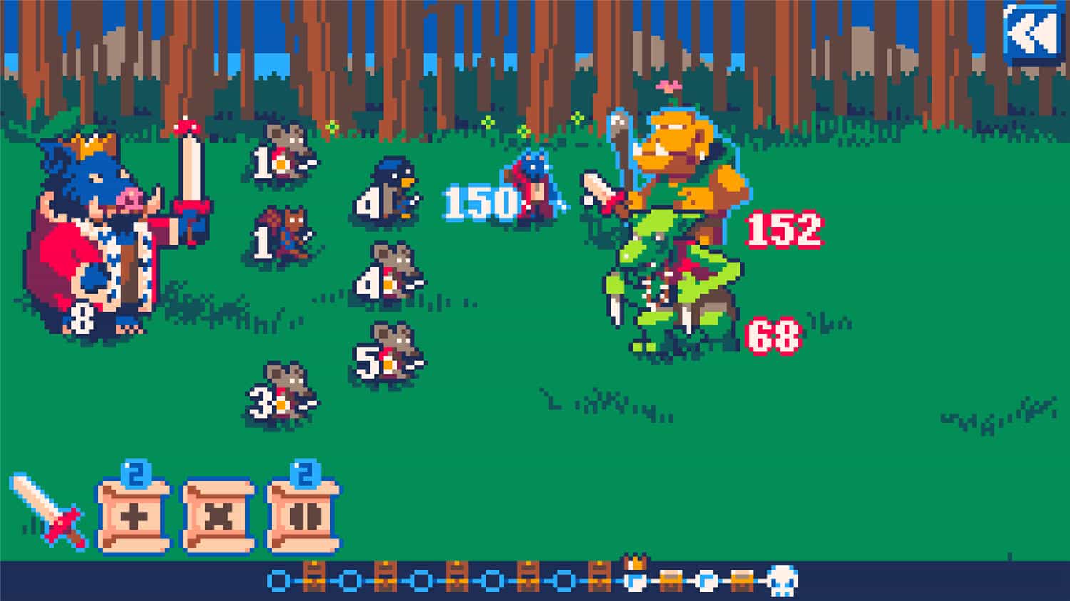 《超级代数大战》是一款轻量级的战术解谜RPG游戏,你将控制一位拥有数学魔法之力的野猪国王!国王可以将自己的动物下属们进行加法和乘法等运算,来获得与任何敌人一战之力!他试图寻求荣耀,一路招募英雄豪杰们来扩充军数,誓要消灭那些危害着动物界的可怕怪物们。