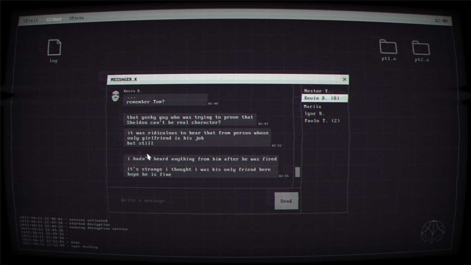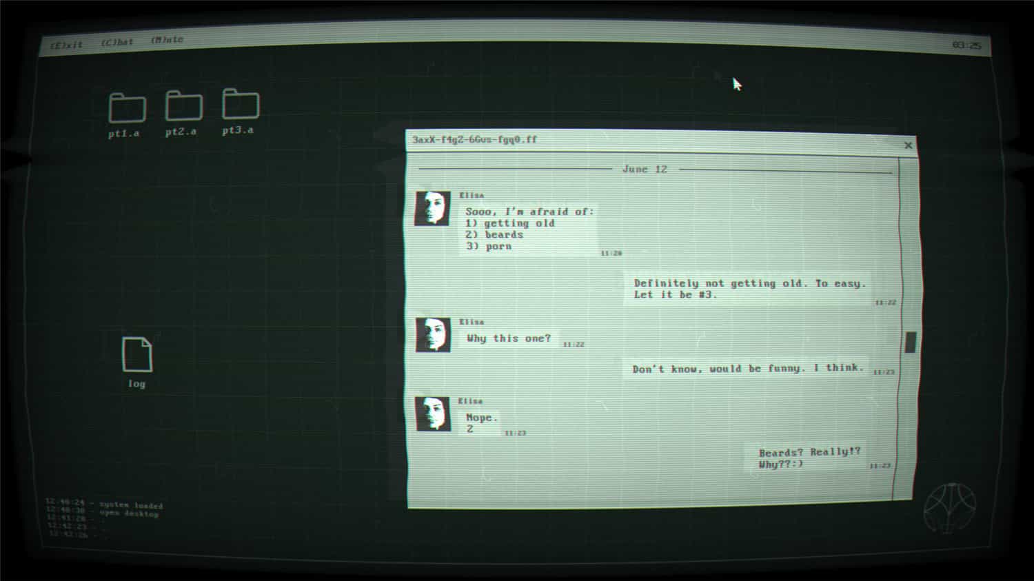 你是詹姆斯·雷诺,一名安全工程师,你为武器领域顶尖的科技公司曼蒂斯公司工作。一般你都是破译公司文件,特殊情况下,你也会破译包含奇怪谈话的文件。当意识到你是在“破译爱情故事”时情况变得愈发奇怪。