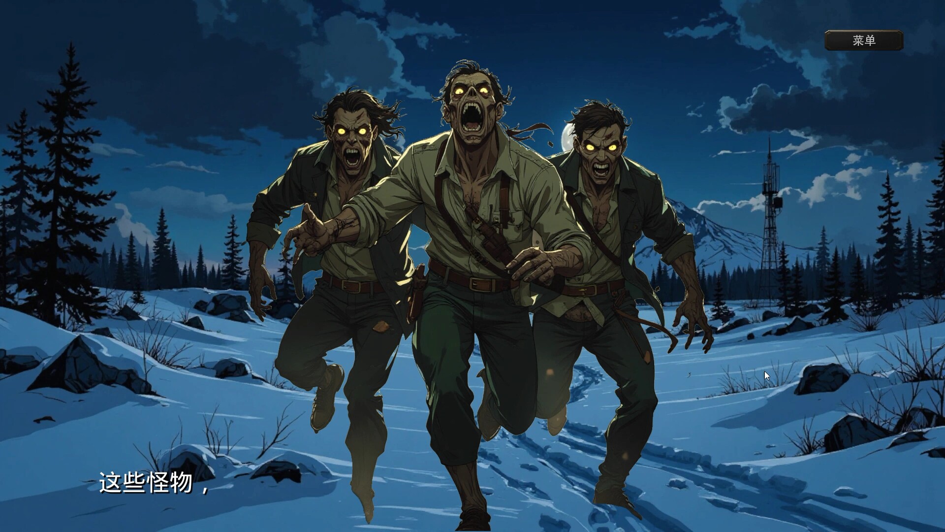这是一款视觉小说类型的游戏。游戏的故事述说了在丧尸横行的冰雪末日,一位逐渐吸血鬼化的父亲必须用非人的力量保护女儿,而每一次狩猎都在侵蚀他最后的人性,这个变成吸血鬼的父亲该如何履行’不伤害人类’的承诺?